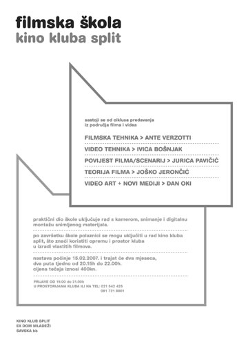 Kino klub Split obavještava sve zainteresirane da 13. veljače 2007. započinje ciklus predavanja koja će se održavati utorkom i četvrtkom od 20.00 do 22.00 sata. Tečaj će trajati dva mjeseca.