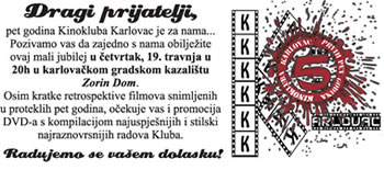 Osim kratke retrospektive filmova snimljenih u proteklih pet godina, očekuje vas i promocija DVD-a s kompilacijom najuspješnijih i stilski najraznovrsnijih radova Kluba.